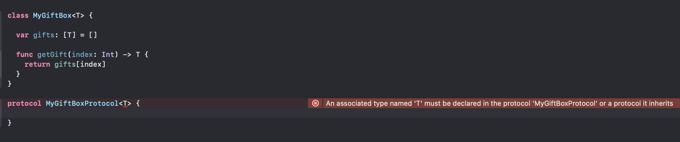 - associatedtype의 실질적인 타입은 프로토콜을 구현한 AppleGifxBox, CherryGiftBox에서 정해진다.