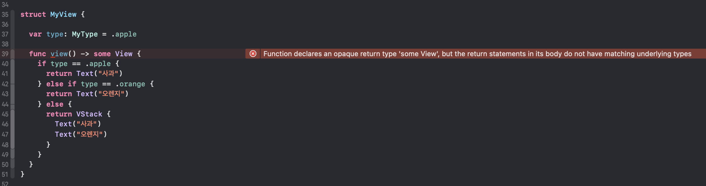 - opaque type이므로 함수 내부에서 어떤 타입을 리턴하는지 결정 해야 하는데, Text와 VStack 은 공통타입이 아니다.