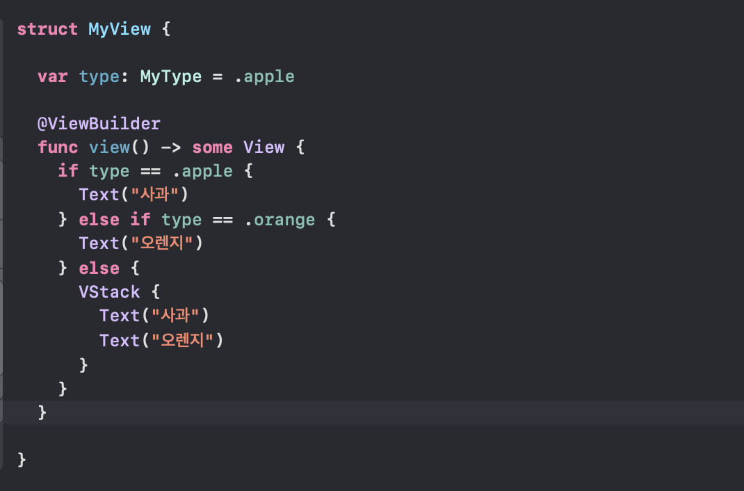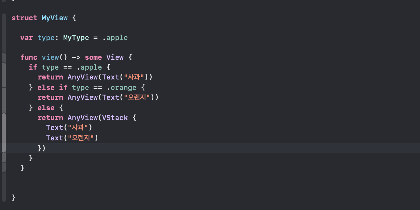 - AnyView 로 감싸 모든 케이스에 대해 AnyView를 리턴하도록 하면 오류는 사라진다.